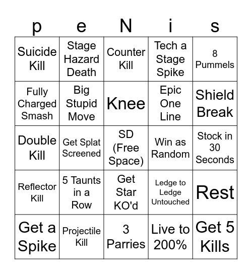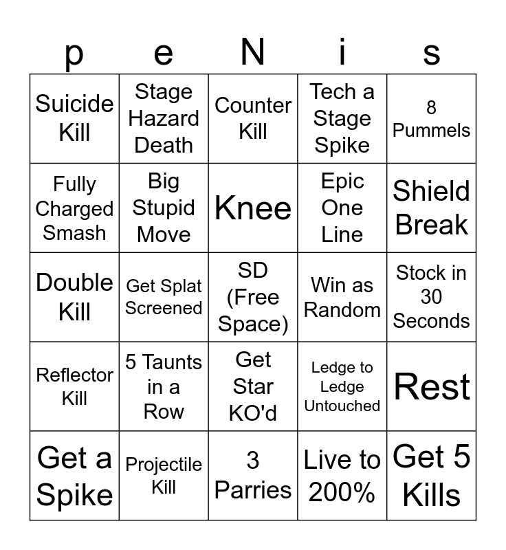 This bingo card has a free space and 24 words: 5 Taunts in a Row, Projectile Kill, Knee, Get a Spike, 8 Pummels, Suicide Kill, Fully Charged Smash, Stage Hazard Death, Win as Random, Get Star KO'd, Epic One Line, Double Kill, Ledge to Ledge Untouched, Rest, Big Stupid Move, Live to 200%, Stock in 30 Seconds, Counter Kill, Shield Break, Get Splat Screened, Get 5 Kills, Reflector Kill, Tech a Stage Spike and 3 Parries.