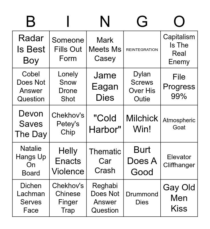 This bingo card has a free space and 24 words: Helly Enacts Violence, Chekhov's Chinese Finger Trap, Jame Eagan Dies, Dichen Lachman Serves Face, Capitalism Is The Real Enemy, Radar Is Best Boy, Cobel Does Not Answer Question, Someone Fills Out Form, Milchick Win!, Thematic Car Crash, Dylan Screws Over His Outie, Devon Saves The Day, Burt Does A Good, Elevator Cliffhanger, Lonely Snow Drone Shot, Drummond Dies, Atmospheric Goat, Mark Meets Ms Casey, File Progress 99%, Chekhov's Petey's Chip, Gay Old Men Kiss, Natalie Hangs Up On Board, REINTEGRATION and Reghabi Does Not Answer Question.