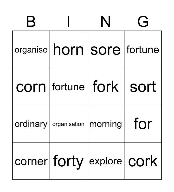 This bingo card has 32 words: Free!, or, for, more, cork, fork, corn, torn, horn, born, sort, sore, short, more, forty, horse, story, morning, border, sport, worn, storm, explore, order, corner, fortune, ordinary, fortune, organise, enormous, ornament and organisation.