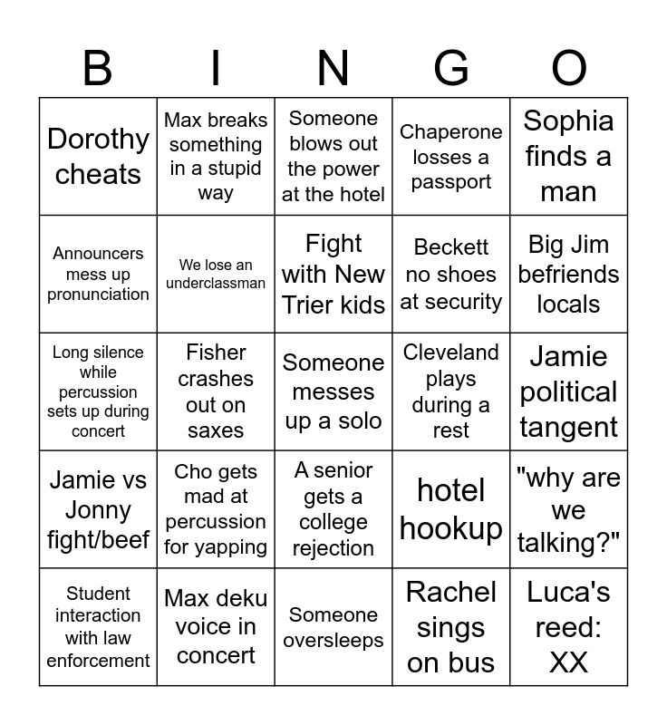 This bingo card has 52 words: El Perkinsi loses something important, Someone messes up a solo, Someone gets food poisoning, Someone oversleeps, Cho gets mad at percussion for yapping, Eli Perkins held up at security, Max breaks something in a stupid way, Beckett Gets sick or someone sick, Announcers mess up pronunciation, "i like my suitcase", We lose an underclassman, Ben Bass crashout, "why are we talking?", hotel hookup, S&S unmemorized, Eli Perkins has an allergic reaction, Fight with New Trier kids, Cleveland plays during a rest, Connor heils, Sophia finds a man, Fisher crashes out on saxes, Rachel sings on bus, Dorothy cheats, Beckett no shoes at security, Genelle gets fine shyt, Luca's reed: XX, Lucas Lauer, Eli, Max, Beckett anime fight, Big Jim befriends locals, Zach N gets asked out, Instrument gets lost on airplane, Chaperone losses a passport, Rachel and Dorthy have a fight, Group gets kicked out of restaurant, Lizzy accidentally eats something with gluten, Someone blows out the power at the hotel, Max deku voice in concert, Someone's instrument gets bent/dented, Isaac begs to wake up at 4 AM to workout, Becket brainrot(free space), Jamie Airball, Jamie political tangent, Jamie vs Jonny fight/beef, A senior gets a college acceptance, A senior gets a college rejection, Someone trips going up to the podium/solo, “Rejected”, Long silence while percussion sets up during concert, Lizzy braids Lucas hair, Percussion equipment falling, Student interaction with law enforcement and Jamie makes a move on new trier bass clarinet.