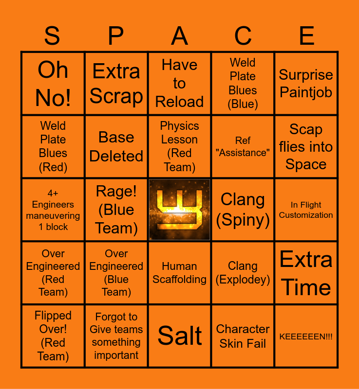 This bingo card has a free space and 31 words: Salt, Rage! (Red Team), Rage! (Blue Team), Rage! (Refs), Oh No!, Have to Reload, Base Deleted, Clang (Explodey), Clang (Spiny), Character Skin Fail, In Flight Customization, KEEEEEEN!!!, W4sted Didn't Think of Something..., Connection Problems, Scap flies into Space, Grinded Held block, Extra Time, Over Engineered (Blue Team), Over Engineered (Red Team), Human Scaffolding, Surprise Paintjob, Flipped Over! (Blue Team), Flipped Over! (Red Team), Extra Scrap, Ref "Assistance", Weld Plate Blues (Red), Weld Plate Blues (Blue), 4+ Engineers maneuvering 1 block, Forgot to Give teams something important, Physics Lesson (Red Team) and Physics Lesson (Blue Team).