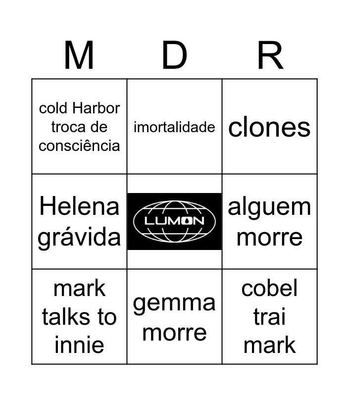 This bingo card has a free space and 8 words: alguem morre, clones, imortalidade, mark talks to innie, cold Harbor troca de consciência, cobel trai mark, Helena grávida and gemma morre.