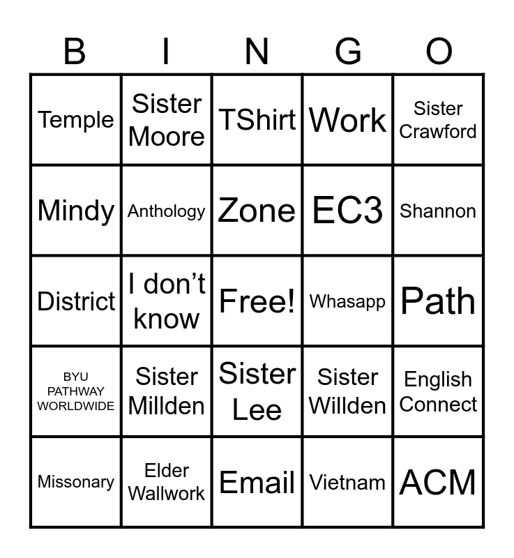 This bingo card has a free space and 24 words: Missonary, Sister Millden, Zone, Vietnam, Sister Crawford, Temple, Sister Moore, TShirt, Whasapp, Path, District, Anthology, Sister Willden, English Connect, Mindy, Elder Wallwork, Email, Work, Shannon, BYU PATHWAY WORLDWIDE, I don’t know, Sister Lee, EC3 and ACM.
