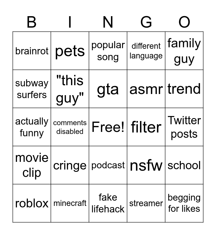 This bingo card has a free space and 24 words: cringe, minecraft, gta, roblox, family guy, brainrot, subway surfers, pets, filter, podcast, asmr, actually funny, nsfw, school, "this guy", streamer, Twitter posts, popular song, trend, comments disabled, begging for likes, movie clip, different language and fake lifehack.