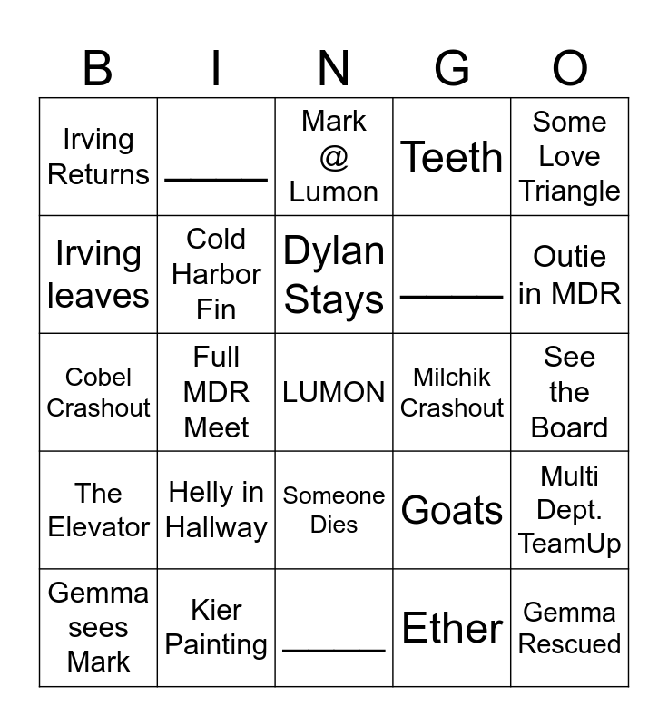 This bingo card has a free space and 24 words: Helly in Hallway, Kier Painting, Dylan Stays, Gemma sees Mark, Some Love Triangle, Irving Returns, Irving leaves, ____, Milchik Crashout, Someone Dies, ____, Cobel Crashout, Goats, Multi Dept. TeamUp, Cold Harbor Fin, Ether, See the Board, Mark @ Lumon, Outie in MDR, Full MDR Meet, Gemma Rescued, The Elevator, Teeth and ____.