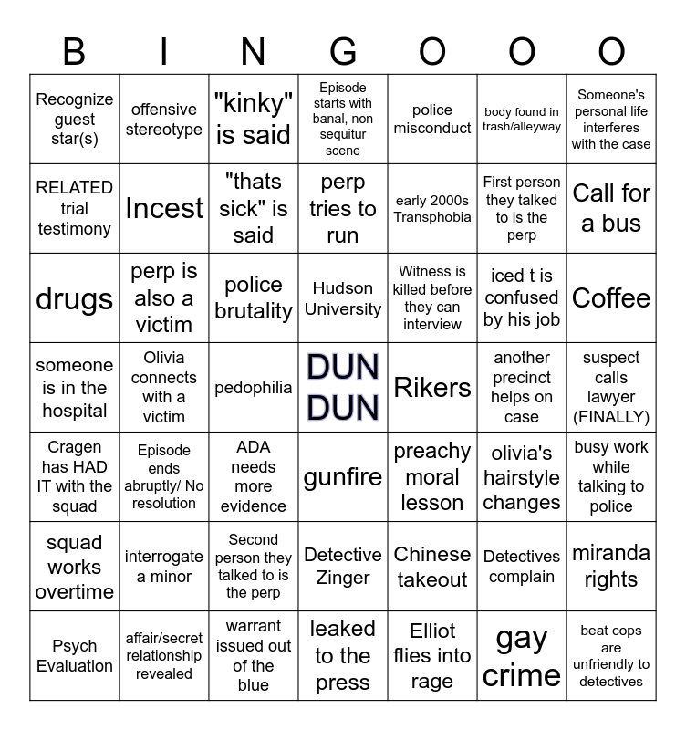 This bingo card has a free space and 55 words: Elliot flies into rage, Coffee, Munch conspiracy, Recognize guest star(s), Olivia connects with a victim, interrogate a minor, Someone's personal life interferes with the case, Unrelated trial testimony, Incest, Second person they talked to is the perp, Episode starts with banal, non sequitur scene, busy work while talking to police, suspect calls lawyer (FINALLY), another precinct helps on case, Psych Evaluation, Cragen has HAD IT with the squad, police misconduct, early 2000s Transphobia, gay crime, First person they talked to is the perp, Call for a bus, Episode ends abruptly/ No resolution, Witness is killed before they can interview, "kinky" is said, unfazed NYC witness, RELATED trial testimony, pedophilia, prostitute killed by rich guy, drugs, iced t is confused by his job, detective's family member gets a B plot, olivia's hairstyle changes, miranda rights, affair/secret relationship revealed, body found in trash/alleyway, perp tries to run, squad works overtime, perp is also a victim, beat cops are unfriendly to detectives, ADA needs more evidence, offensive stereotype, Detective Zinger, Chinese takeout, dumpster diving, police brutality, someone is in the hospital, warrant issued out of the blue, preachy moral lesson, Rikers, "thats sick" is said, gunfire, Detectives complain, leaked to the press, Hudson University and episode starts with someone finding a body.