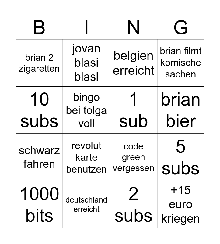 This bingo card has 16 words: deutschland erreicht, 5 subs, belgien erreicht, brian 2 zigaretten, schwarz fahren, jovan blasi blasi, code green vergessen, 2 subs, 10 subs, bingo bei tolga voll, 1000 bits, brian filmt komische sachen, revolut karte benutzen, brian bier, 1 sub and +15 euro kriegen.
