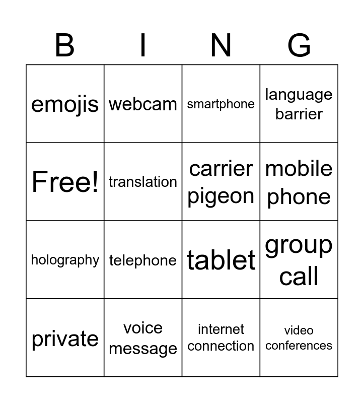 This bingo card has 16 words: voice message, group call, smartphone, emojis, holography, webcam, tablet, internet connection, Free!, translation, private, language barrier, telephone, mobile phone, carrier pigeon and video conferences.