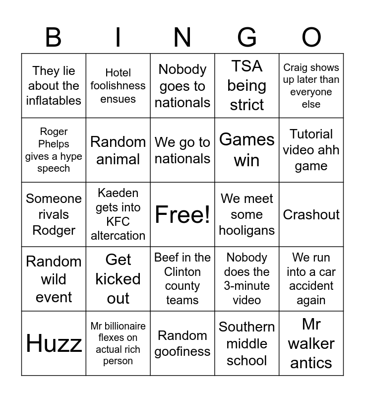 This bingo card has a free space and 24 words: Get kicked out, Mr billionaire flexes on actual rich person, We go to nationals, Huzz, Craig shows up later than everyone else, They lie about the inflatables, Roger Phelps gives a hype speech, Hotel foolishness ensues, We meet some hooligans, Beef in the Clinton county teams, Games win, Someone rivals Rodger, Nobody does the 3-minute video, We run into a car accident again, Random animal, Southern middle school, Crashout, Nobody goes to nationals, Tutorial video ahh game, Kaeden gets into KFC altercation, Mr walker antics, Random wild event, TSA being strict and Random goofiness.