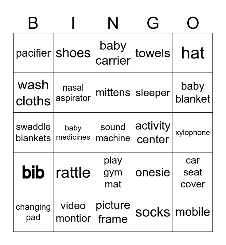 This bingo card has 30 words: video montior, milestone blanket, baby medicines, comb/ hairbrush, pacifier, baby carrier, nasal aspirator, play gym mat, activity center, picture frame, xylophone, sound machine, socks, mobile, baby blanket, teether, onesie, bib, rattle, hat, swaddle blankets, burb cloths, shoes, sleeper, wash cloths, towels, car seat cover, changing pad, mittens and diapers.