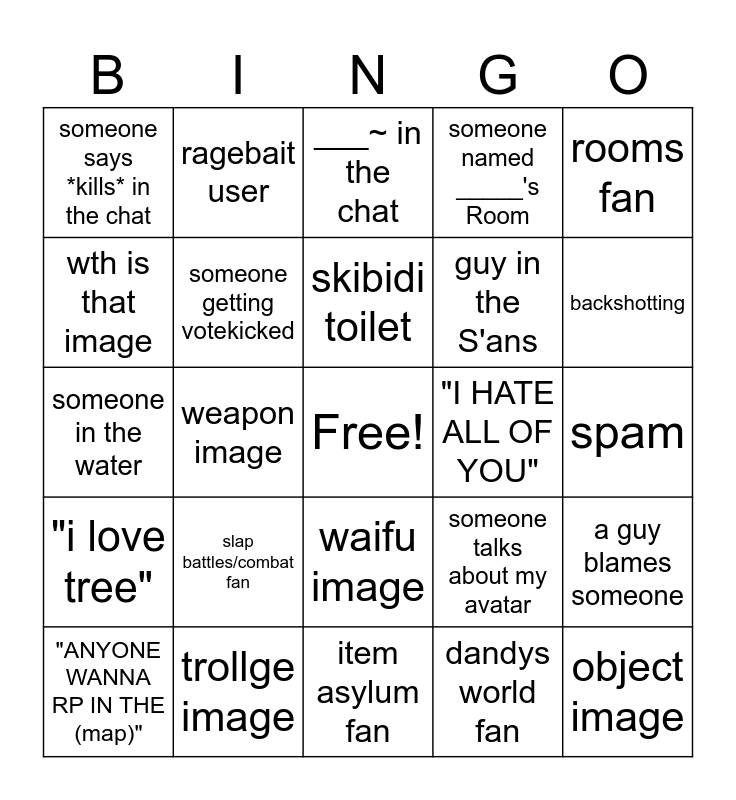 This bingo card has a free space and 24 words: slap battles/combat fan, trollge image, skibidi toilet, "ANYONE WANNA RP IN THE (map)", rooms fan, someone says *kills* in the chat, wth is that image, ragebait user, "I HATE ALL OF YOU", waifu image, guy in the S'ans, someone in the water, someone talks about my avatar, a guy blames someone, someone getting votekicked, dandys world fan, spam, ___~ in the chat, backshotting, weapon image, object image, "i love tree", someone named _____'s Room and item asylum fan.