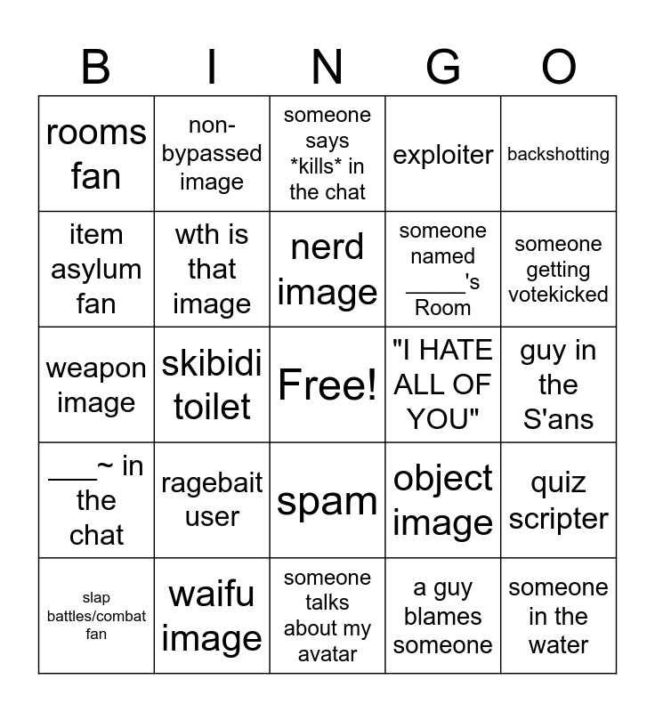 This bingo card has a free space and 29 words: slap battles/combat fan, trollge image, skibidi toilet, "ANYONE WANNA RP IN THE (map)", rooms fan, someone says *kills* in the chat, wth is that image, ragebait user, "I HATE ALL OF YOU", waifu image, guy in the S'ans, someone in the water, someone talks about my avatar, a guy blames someone, someone getting votekicked, dandys world fan, spam, ___~ in the chat, backshotting, weapon image, object image, "i love tree", someone named _____'s Room, item asylum fan, exploiter, non-bypassed image, quiz scripter, nerd image and lag.