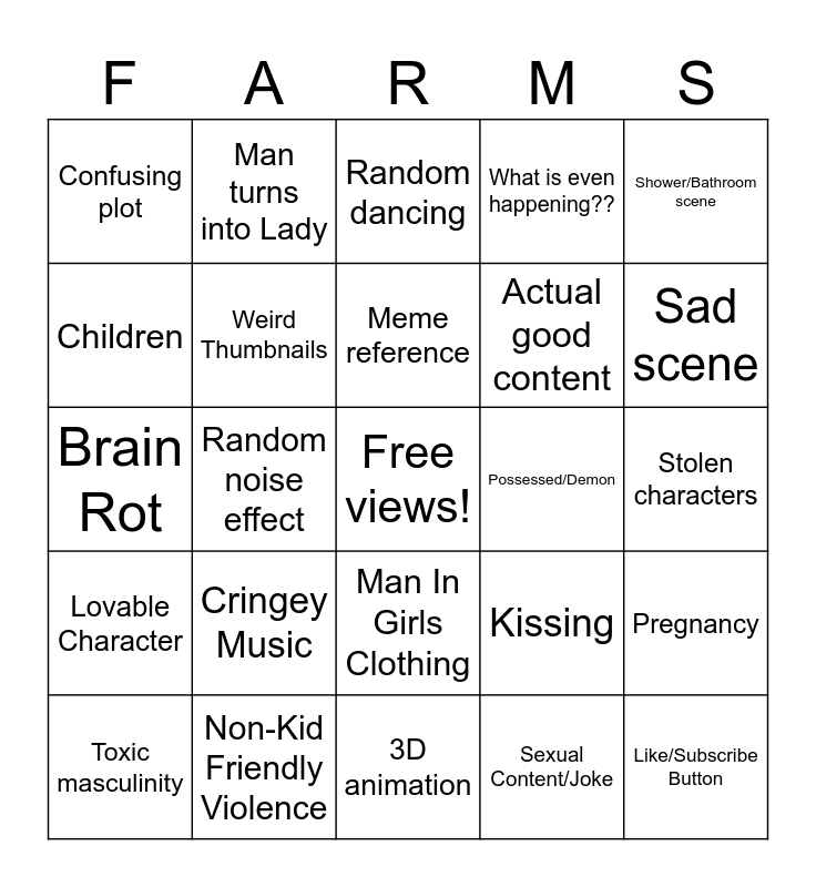 This bingo card has a free space and 57 words: Crappy Customes, Wtf Moments, Weird Content, What is even happening??, Stolen characters, Characters not being in character, Random noise effect, Funny plot that's unfunny, Actual good content, Dumb airhead character, Confusing plot, Plot twist, Cringey intro, Pregnancy, Really buff man/woman, Merch plug, Random dancing, Kissing, Weird dialog, Children, Non-Kid Friendly Violence, Graphic Details, Sexual Content/Joke, Shower/Bathroom scene, Murderer, Cringey Music, Auto tune, Terrible voice acting, Sad scene, Toxic masculinity, Funny, Random character, Overconfident character, Flirty, Brain Rot, Weird Thumbnails, Satanic Symbol, Possessed/Demon, Like/Subscribe Button, Lovable Character, Man turns into Lady, 3D animation, Blood, Guns, AI, In a relationship, Meme reference, Explosion, Creator has over a million subscribers, Spelling error, "Help me!" [Like and Sub], Man In Girls Clothing, Takes Someone Hostage, Gay Scene, Giving Birth, Stalking and Sexual Harassment.