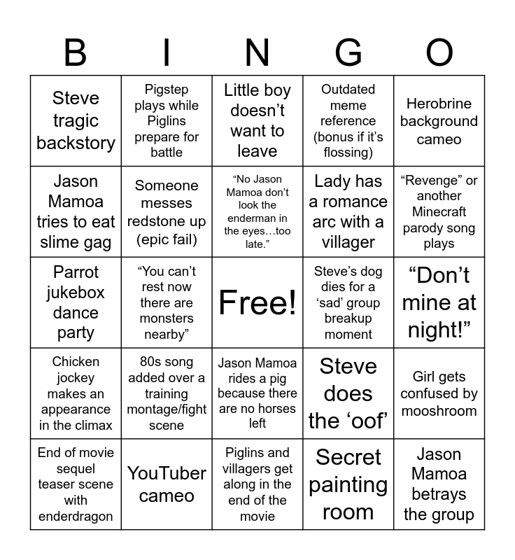 This bingo card has a free space and 24 words: 80s song added over a training montage/fight scene, YouTuber cameo, “No Jason Mamoa don’t look the enderman in the eyes…too late.”, End of movie sequel teaser scene with enderdragon, Herobrine background cameo, Steve tragic backstory, Jason Mamoa tries to eat slime gag, Pigstep plays while Piglins prepare for battle, Steve’s dog dies for a ‘sad’ group breakup moment, Jason Mamoa rides a pig because there are no horses left, Lady has a romance arc with a villager, Parrot jukebox dance party, Steve does the ‘oof’, Girl gets confused by mooshroom, Someone messes redstone up (epic fail), Secret painting room, “Don’t mine at night!”, Little boy doesn’t want to leave, “Revenge” or another Minecraft parody song plays, “You can’t rest now there are monsters nearby”, Jason Mamoa betrays the group, Chicken jockey makes an appearance in the climax, Outdated meme reference (bonus if it’s flossing) and Piglins and villagers get along in the end of the movie.