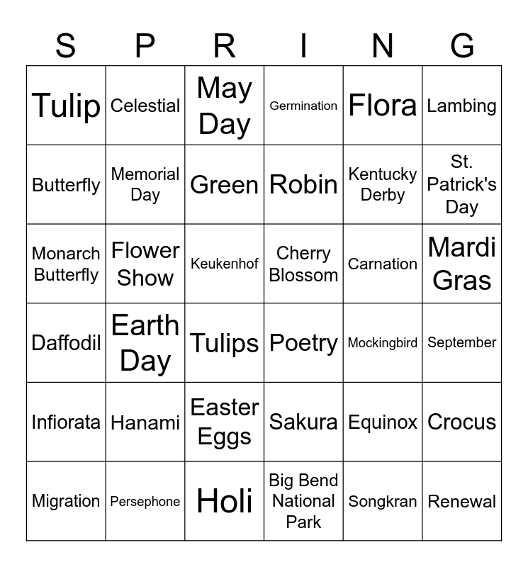 This bingo card has 66 words: Free!, Equinox, Daffodil, Earth Day, Hanami, Maple, Celestial, Hibernate, Memorial Day, Peeps, Mardi Gras, Pollination, Keukenhof, Flora, Swallow, Lambing, St. Patrick's Day, Tulip, Jon Hamm, Green, Carnation, Cherry Blossom, Germination, Migration, Lily, Songkran, Holi, Strawberries, Monarch Butterfly, Russell Stover, Tulips, Macy's Parade, Cherry Blossoms, Rainy, Daffodil, Poetry, Shortcake, Kentucky Derby, September, Renewal, Butterfly, Easter Eggs, Flower Show, Rose, Asparagus, Persephone, Robin, April Fool's Day, Infiorata, Sakura, Paschal, Frog, Wasp, Lyrids, Egg, Crocus, Venus, Panama City Beach, May Day, Mockingbird, Big Bend National Park, Aries and Taurus, Maypole dance, Georgia, Sunday and Vitamin D.