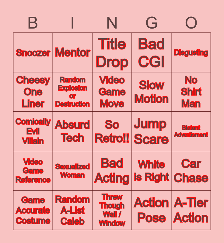 This bingo card has a free space and 24 words: Sexualized Woman, Random A-List Caleb, Video Game Move, Game Accurate Costume, Disgusting, Snoozer, Cheesy One Liner, Mentor, Jump Scare, Bad Acting, Slow Motion, Comically Evil Villain, White is Right, Car Chase, Random Explosion or Destruction, Action Pose, Blatant Advertisment, Title Drop, No Shirt Man, Absurd Tech, A-Tier Action, Video Game Reference, Bad CGI and Threw Though Wall / Window.