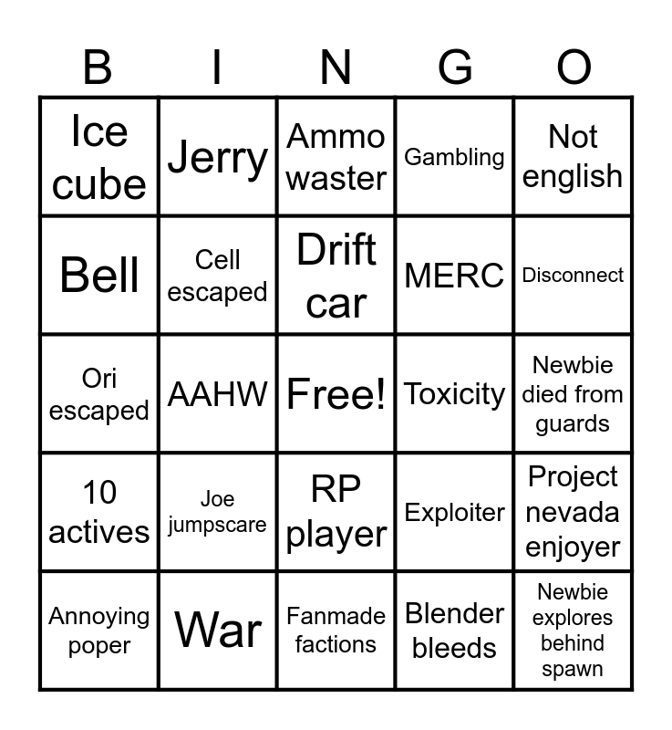 This bingo card has a free space and 24 words: Annoying poper, Joe jumpscare, Drift car, Blender bleeds, Not english, Ice cube, Jerry, Ammo waster, Toxicity, Newbie died from guards, Ori escaped, Cell escaped, Exploiter, Project nevada enjoyer, Bell, War, Fanmade factions, Gambling, Disconnect, 10 actives, AAHW, RP player, MERC and Newbie explores behind spawn.