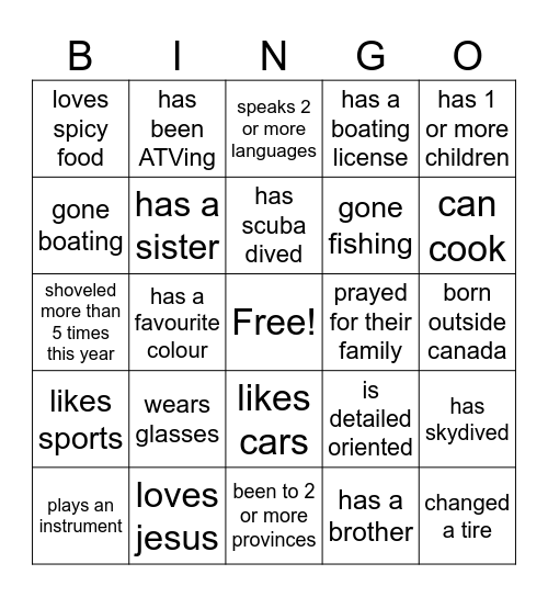 This bingo card has a free space and 29 words: plays an instrument, done a oil change, has a favourite colour, taught a bible study, loves spicy food, speaks 2 or more languages, has a sister, wears glasses, prayed for their family, loves jesus, born outside canada, changed a tire, been to 2 or more provinces, has a brother, can cook, been to bible school, likes cars, likes sports, has 1 or more children, shoveled more than 5 times this year, is detailed oriented, hunted, gone fishing, gone boating, has a boating license, has been ATVing, has skydived, has scuba dived and is patient.