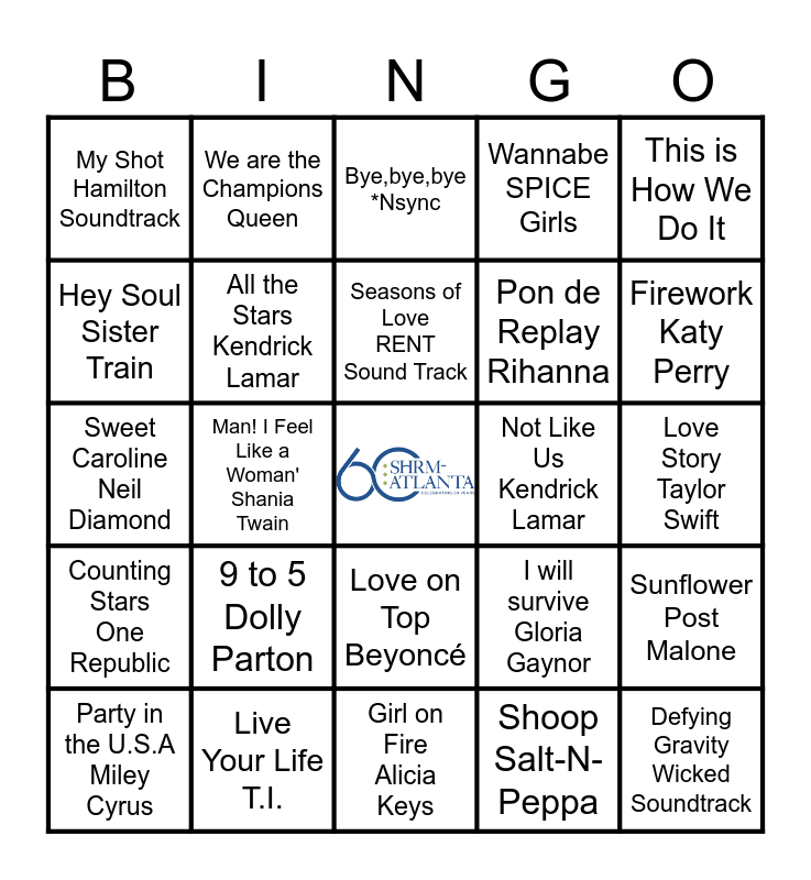 This bingo card has a free space and 24 words: 9 to 5 Dolly Parton, Live Your Life T.I., Seasons of Love RENT Sound Track, Party in the U.S.A Miley Cyrus, This is How We Do It, My Shot Hamilton Soundtrack, Hey Soul Sister Train, We are the Champions Queen, Not Like Us Kendrick Lamar, Love on Top Beyoncé, Pon de Replay Rihanna, Sweet Caroline Neil Diamond, I will survive Gloria Gaynor, Sunflower Post Malone, All the Stars Kendrick Lamar, Shoop Salt-N-Peppa, Love Story Taylor Swift, Bye,bye,bye *Nsync, Firework Katy Perry, Man! I Feel Like a Woman' Shania Twain, Defying Gravity Wicked Soundtrack, Counting Stars One Republic, Wannabe SPICE Girls and Girl on Fire Alicia Keys.