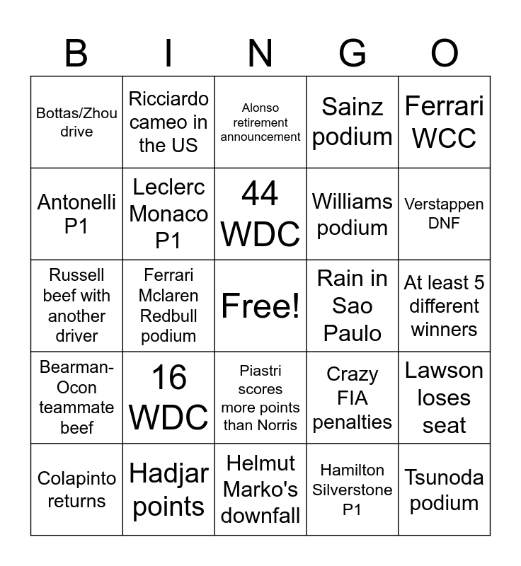 This bingo card has a free space and 24 words: 16 WDC, Hadjar points, 44 WDC, Colapinto returns, Ferrari WCC, Bottas/Zhou drive, Antonelli P1, Ricciardo cameo in the US, Rain in Sao Paulo, Piastri scores more points than Norris, Williams podium, Russell beef with another driver, Crazy FIA penalties, Lawson loses seat, Leclerc Monaco P1, Hamilton Silverstone P1, At least 5 different winners, Alonso retirement announcement, Verstappen DNF, Ferrari Mclaren Redbull podium, Tsunoda podium, Bearman-Ocon teammate beef, Sainz podium and Helmut Marko's downfall.