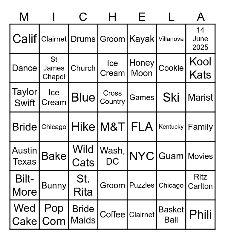 This bingo card has a free space and 50 words: Ritz Carlton, Cookie, Basket Ball, Chicago, Blue, Wash, DC, Clairnet, Coffee, Villanova, NYC, 14 June 2025, Groom, Ski, Games, St. Rita, Family, Dance, Kool Kats, Wed Cake, Kayak, Honey Moon, Hike, Calif, St James Chapel, Pop Corn, Phili, Church, Bride Maids, Drums, Cross Country, Coffee, Austin Texas, Bunny, Groom, Bride, Kentucky, Guam, Movies, Bilt- More, Taylor Swift, Wild Cats, Puzzles, Bake, Clairnet, Marist, Ice Cream, FLA, Chicago, Ice Cream and Coffee.