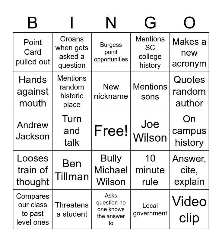 This bingo card has a free space and 24 words: Ben Tillman, Threatens a student, New nickname, Compares our class to past level ones, Makes a new acronym, Point Card pulled out, Hands against mouth, Groans when gets asked a question, Joe Wilson, Bully Michael Wilson, Mentions sons, Andrew Jackson, 10 minute rule, Answer, cite, explain, Mentions random historic place, Local government, On campus history, Burgess point opportunities, Quotes random author, Turn and talk, Video clip, Looses train of thought, Mentions SC college history and Asks question no one knows the answer to.
