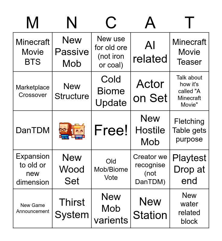 This bingo card has 1 images, a free space and 23 words: New Wood Set, Thirst System, Cold Biome Update, New Game Announcement, Minecraft Movie Teaser, Minecraft Movie BTS, Marketplace Crossover, New Passive Mob, New Hostile Mob, Old Mob/Biome Vote, Actor on Set, DanTDM, Creator we recognise (not DanTDM), Playtest Drop at end, New Structure, New Station, Fletching Table gets purpose, New use for old ore (not iron or coal), Talk about how it's called "A Minecraft Movie", New water related block, Expansion to old or new dimension, AI related and New Mob varients.