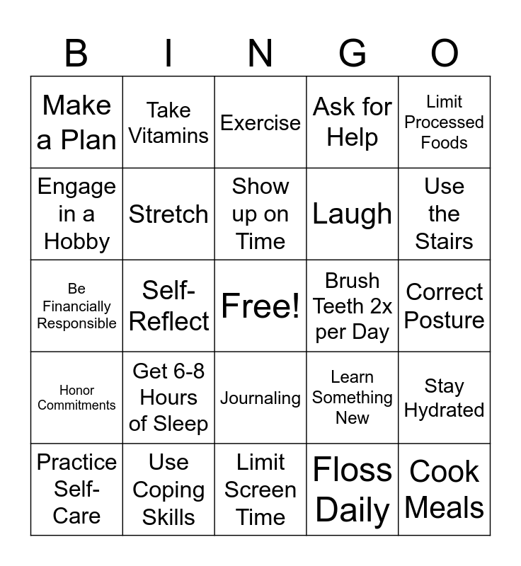 This bingo card has a free space and 24 words: Get 6-8 Hours of Sleep, Use Coping Skills, Show up on Time, Practice Self-Care, Limit Processed Foods, Make a Plan, Engage in a Hobby, Take Vitamins, Brush Teeth 2x per Day, Journaling, Laugh, Be Financially Responsible, Learn Something New, Stay Hydrated, Stretch, Floss Daily, Correct Posture, Exercise, Use the Stairs, Self-Reflect, Cook Meals, Honor Commitments, Ask for Help and Limit Screen Time.