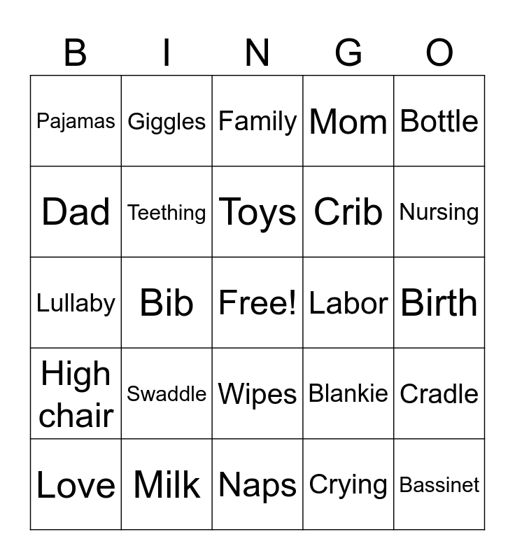 This bingo card has a free space and 28 words: Cradle, Crawling, Crib, Crying, Dad, Family, Giggles, High chair, Labor, Love, Lullaby, Mom, Milk, Naps, Nursing, Onesie, Swaddle, Teething, Toys, Wipes, Pajamas, Baby, Bassinet, Bib, Birth, Blankie, Bottle and Burp cloth.