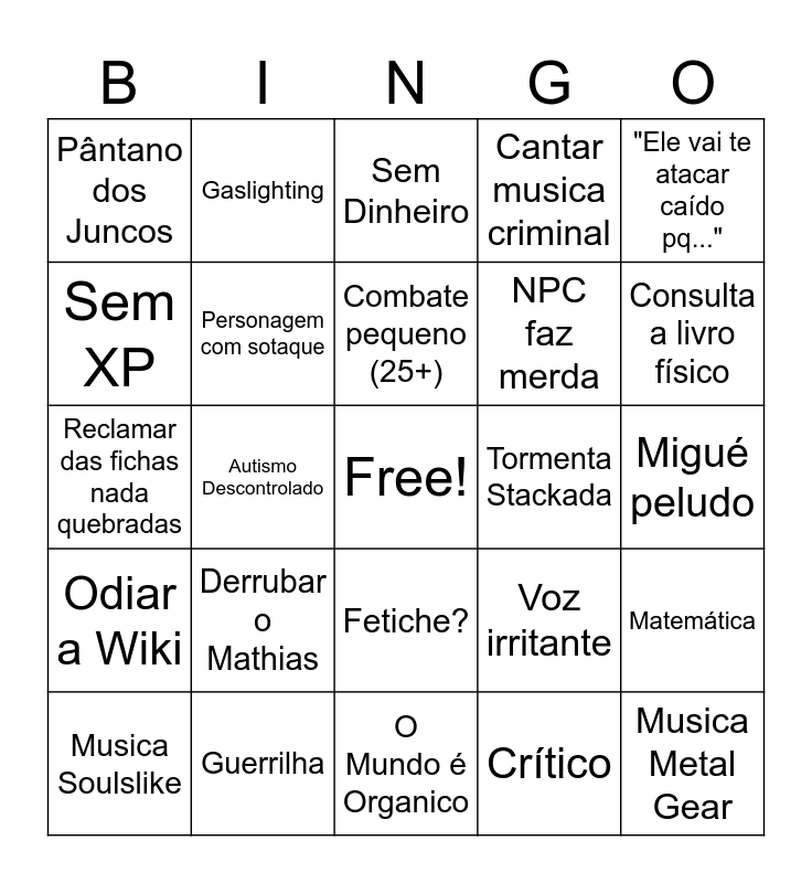 This bingo card has a free space and 26 words: Fetiche?, Crítico, Combate pequeno (25+), Guerrilha, "Ele vai te atacar caído pq...", Pântano dos Juncos, Sem XP, Gaslighting, Migué peludo, Voz irritante, NPC faz merda, Reclamar das fichas nada quebradas, Matemática, Musica Soulslike, Autismo Descontrolado, JoJo, Cantar musica criminal, Odiar a Wiki, Sem Dinheiro, Musica Metal Gear, Consulta a livro físico, O Mundo é Organico, Tormenta Stackada, Derrubar o Mathias, Personagem com sotaque and Metade do mapa é terreno difícil.