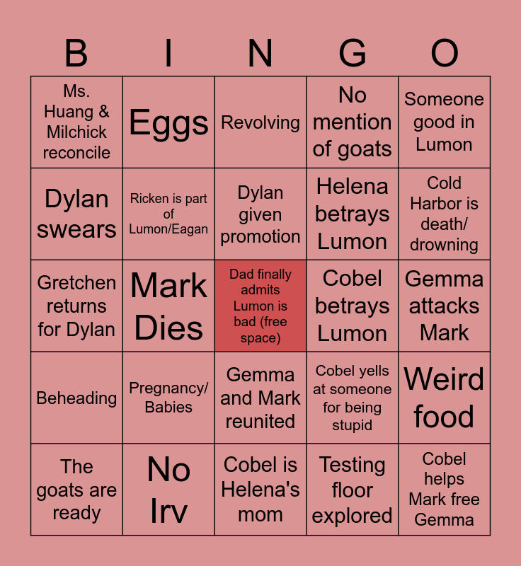 This bingo card has a free space and 24 words: Pregnancy/ Babies, No Irv, Dylan given promotion, The goats are ready, Someone good in Lumon, Ms. Huang & Milchick reconcile, Dylan swears, Eggs, Cobel betrays Lumon, Gemma and Mark reunited, Helena betrays Lumon, Gretchen returns for Dylan, Cobel yells at someone for being stupid, Weird food, Ricken is part of Lumon/Eagan, Testing floor explored, Gemma attacks Mark, Revolving, Cold Harbor is death/ drowning, Mark Dies, Cobel helps Mark free Gemma, Beheading, No mention of goats and Cobel is Helena's mom.
