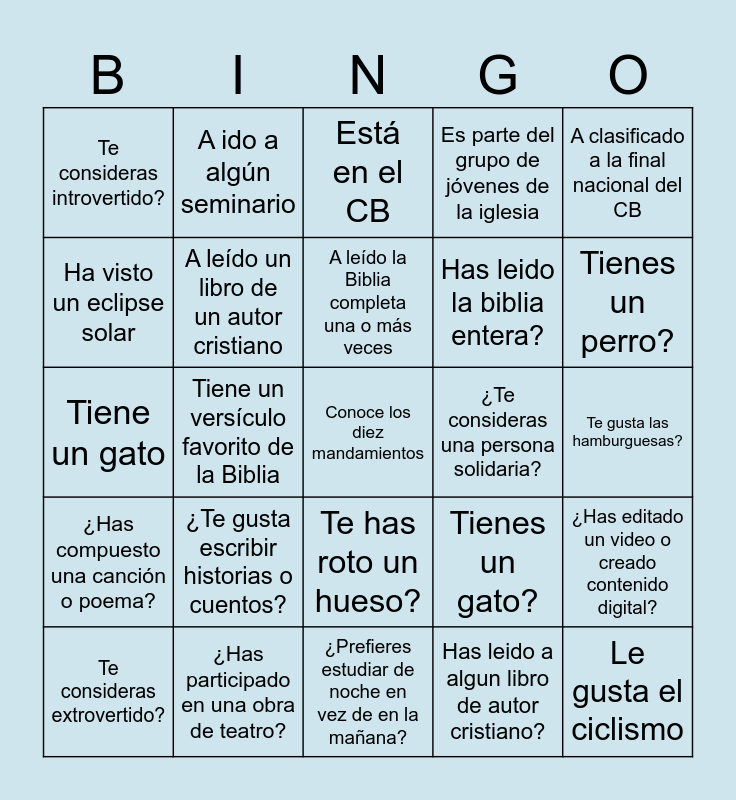 This bingo card has 77 words: Le gusta Leer mucho, Toca algún instrumento, Está en el CB, Tiene un perro, Le gusta cocinar, Le gusta nadar, Le gustan las hamburguesas, Le gusta el fútbol, Ha viajado fuera del país, Le gusta hacer senderismo, Le gusta el ciclismo, Participa en la orquesta de la iglesia, A leído la Biblia completa una o más veces, Ha visto un eclipse solar, Le gusta el café, Tiene un versículo favorito de la Biblia, Le gustan los mariscos, Conoce los diez mandamientos, A asistido a algún campamento de jóvenes, A clasificado a la final nacional del CB, Alguien que asiste a la escuela dominical, Tiene un gato, A leído un libro de un autor cristiano, A ido a algún seminario, Es parte del grupo de jóvenes de la iglesia, Practicas algun deporte?, Juegas algun videojuego?, Te gusta dibujar o pintar?, Te gusta el café?, Te gusta el ciclismo?, Has viajado fuera del país?, Te gusta cocinar?, Has visto un eclipse solar?, Tienes un gato?, Tienes un perro?, Has leido la biblia entera?, Conoces los 10 mandamientos, Te gusta el pescado?, Te gusta las hamburguesas?, Has leido a algun libro de autor cristiano?, Vienes a la escuela dominical?, Te sabes 3 versiculo de memoria?, Sabes Cantar?, Has viajado en Avion?, Sabes hablar en publico?, Te gusta organizar las cosas?, Te consideras extrovertido?, Te consideras introvertido?, Te gusta escuchar a las personas?, Prefieres el verano que el invierno?, Tu color preferido es el rojo?, Te has roto un hueso?, Te gusta la comida picante?, Te cosnideras creativo?, Sabes resolver un cubo de rubik?, Planeas ir a la universidad o al instituto?, Planeas ir al seminario?, Has visitado algun monumento famoso?, Sabes primeros auxilios?, Sabes otro idioma aparte del español?, ¿Te gusta escribir historias o cuentos?, ¿Se te facilitan las matemáticas?, ¿Te gusta aprender sobre historia y cultura?, ¿Has leído más de tres libros completos en el último año?, ¿Sabes nadar?, ¿Sabes jugar ajedrez o algún otro deporte mental?, ¿Has participado en actividades de voluntariado?, ¿Te consideras una persona solidaria?, ¿Has organizado un evento o actividad para otras personas?, ¿Puedes coser un botón o hacer una costura sencilla?, ¿Te gustan las manualidades o el bricolaje?, ¿Has editado un video o creado contenido digital?, ¿Has compuesto una canción o poema?, ¿Has participado en una obra de teatro?, Has ganado un concurso en la universidad/colegio?, ¿Prefieres estudiar de noche en vez de en la mañana? and ¿Te consideras bueno/a en la ortografía y gramática?.
