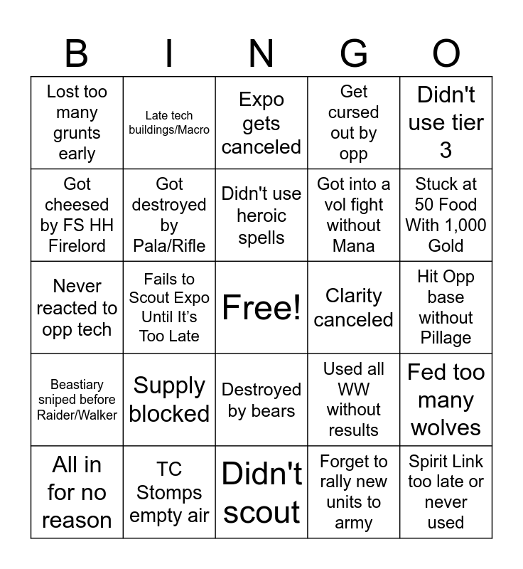 This bingo card has a free space and 25 words: Supply blocked, Didn't scout, Didn't use heroic spells, All in for no reason, Didn't use tier 3, Lost too many grunts early, Got cheesed by FS HH Firelord, Late tech buildings/Macro, Clarity canceled, Destroyed by bears, Got into a vol fight without Mana, Never reacted to opp tech, Used all WW without results, Fed too many wolves, Got destroyed by Pala/Rifle, Lost Blademaster, Hit Opp base without Pillage, Expo gets canceled, Stuck at 50 Food With 1,000 Gold, Fails to Scout Expo Until It’s Too Late, Spirit Link too late or never used, TC Stomps empty air, Beastiary sniped before Raider/Walker, Get cursed out by opp and Forget to rally new units to army.