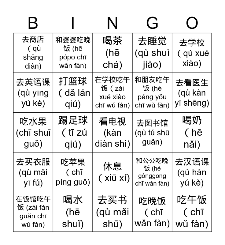 This bingo card has a free space and 27 words: 和公公吃晚饭 (hé gónggong chī wǎn fàn), 去看电影 (qù kàn diàn yíng), 和朋友吃午饭 (hé péng yǒu chī wǔ fàn), 去买书 (qù mǎi shū), 去英语课 (qù yīng yú kè), 喝茶 (hē chá), 和婆婆吃晚饭 (hē pópo chī wǎn fàn), 去买衣服 (qù mǎi yī fú), 去图书馆 (qù tú shū guǎn), 去汉语课 (qù hàn yú kè), 吃水果 (chī shuǐ guǒ), 去睡觉 (qù shuì jiào), 在饭馆吃午饭 (zài fàn guǎn chī wǔ fàn), 喝水 (hē shuǐ), 去看医生 (qù kàn yī shēng), 吃米饭(chī mǐ fàn), 打篮球 (dǎ lán qiú), 在学校吃午饭(zài xué xiào chī wǔ fàn), 吃苹果 (chī píng guǒ), 去商店 (qù shāng diàn), 喝奶(hē nǎi), 吃晚饭 (chī wǎn fàn), 踢足球 (tī zú qiú), 吃午饭 (chī wǔ fàn), 休息 (xiū xí), 去学校 (qù xué xiào) and 吃早饭 (chī zǎo fàn).