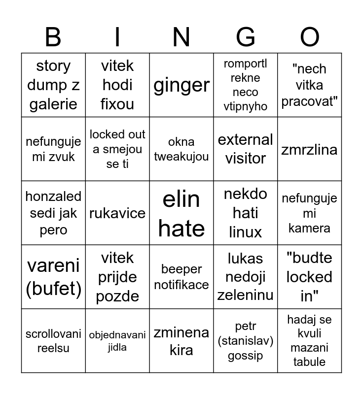This bingo card has a free space and 24 words: vitek prijde pozde, objednavani jidla, okna tweakujou, scrollovani reelsu, "nech vitka pracovat", story dump z galerie, nefunguje mi zvuk, vitek hodi fixou, nekdo hati linux, beeper notifikace, external visitor, honzaled sedi jak pero, lukas nedoji zeleninu, "budte locked in", locked out a smejou se ti, petr (stanislav) gossip, nefunguje mi kamera, ginger, zmrzlina, rukavice, hadaj se kvuli mazani tabule, vareni (bufet), romportl rekne neco vtipnyho and zminena kira.