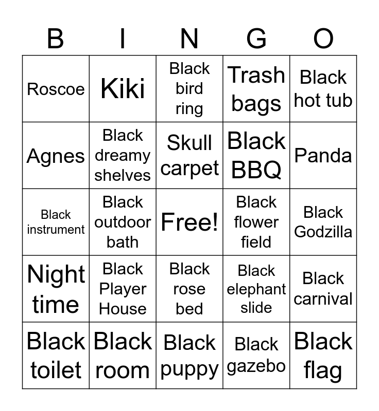 This bingo card has a free space and 24 words: Black Player House, Black room, Skull carpet, Black toilet, Black hot tub, Roscoe, Agnes, Kiki, Black flower field, Black rose bed, Black BBQ, Black instrument, Black elephant slide, Black carnival, Black dreamy shelves, Black gazebo, Black Godzilla, Black bird ring, Panda, Black outdoor bath, Black flag, Night time, Trash bags and Black puppy.