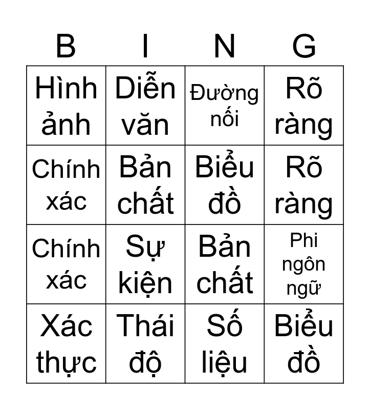 This bingo card has 25 words: Thông tin, Khách quan, Bản chất, Mạch lạc, Hình ảnh, Diễn văn, Đường nối, Rõ ràng, Chính xác, Sự kiện, Số liệu, Phi ngôn ngữ, Ngôn ngữ, Thái độ, Biểu đồ, Nội quy, Xác thực, Bản chất, Mạch lạc, Biểu đồ, Chính xác, Đơn giản, Thái độ, Rõ ràng and Hình ảnh.
