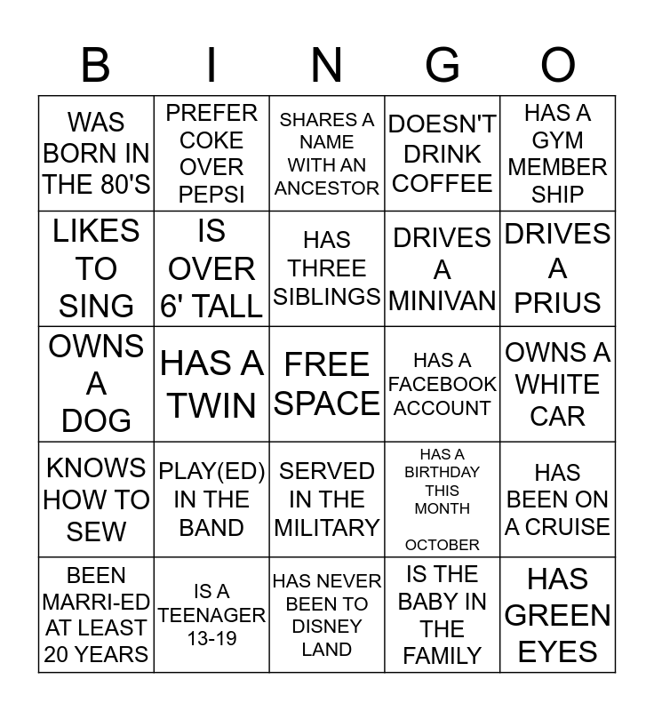 This bingo card has a free space and 24 words: PLAY(ED) IN THE BAND, IS A TEENAGER 13-19, HAS THREE SIBLINGS, BEEN MARRI-ED AT LEAST 20 YEARS, HAS A GYM MEMBER SHIP, WAS BORN IN THE 80'S, LIKES TO SING, PREFER COKE OVER PEPSI, HAS A FACEBOOK ACCOUNT, SERVED IN THE MILITARY, DRIVES A MINIVAN, OWNS A DOG, HAS A BIRTHDAY THIS MONTH OCTOBER, HAS BEEN ON A CRUISE, IS OVER 6' TALL, IS THE BABY IN THE FAMILY, OWNS A WHITE CAR, SHARES A NAME WITH AN ANCESTOR, DRIVES A PRIUS, HAS A TWIN, HAS GREEN EYES, KNOWS HOW TO SEW, DOESN'T DRINK COFFEE and HAS NEVER BEEN TO DISNEY LAND.
