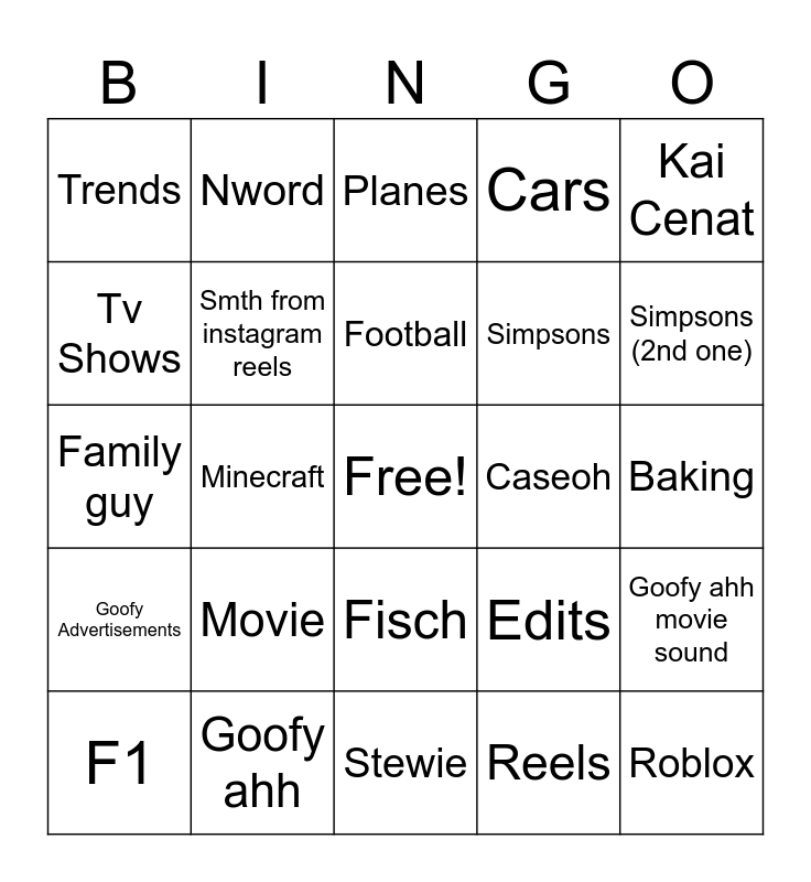 This bingo card has a free space and 24 words: Movie, Goofy ahh, Football, F1, Kai Cenat, Trends, Tv Shows, Nword, Caseoh, Fisch, Simpsons, Family guy, Edits, Goofy ahh movie sound, Smth from instagram reels, Reels, Baking, Planes, Simpsons (2nd one), Minecraft, Roblox, Goofy Advertisements, Cars and Stewie.