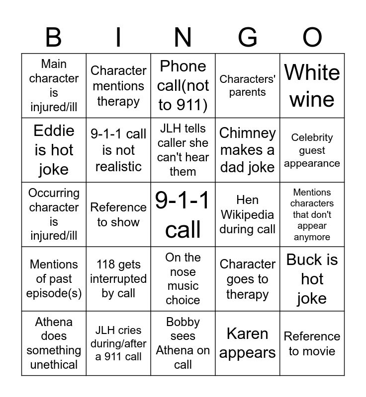 This bingo card has a free space and 24 words: 118 gets interrupted by call, JLH cries during/after a 911 call, JLH tells caller she can't hear them, Athena does something unethical, White wine, Main character is injured/ill, Eddie is hot joke, Character mentions therapy, Hen Wikipedia during call, On the nose music choice, Chimney makes a dad joke, Occurring character is injured/ill, Character goes to therapy, Buck is hot joke, 9-1-1 call is not realistic, Karen appears, Mentions characters that don't appear anymore, Phone call(not to 911), Celebrity guest appearance, Reference to show, Reference to movie, Mentions of past episode(s), Characters' parents and Bobby sees Athena on call.