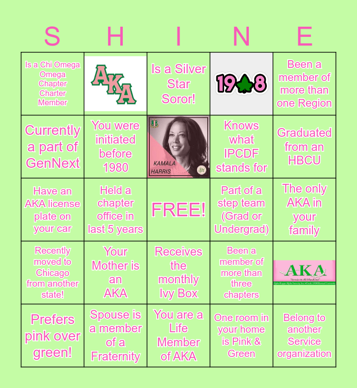 This bingo card has 4 images, a free space and 25 words: Prefers pink over green!, Registered to attend the Central Regional Conference 2025, Held a chapter office in last 5 years, Has a co-initiate in Chi Omega Omega Chapter, Is a Chi Omega Omega Chapter Charter Member, Is a Silver Star Soror!, You were initiated before 1980, Your Mother is an AKA, Part of a step team (Grad or Undergrad), Spouse is a member of a Fraternity, The only AKA in your family, Belong to another Service organization, You are a Life Member of AKA, One room in your home is Pink & Green, Graduated from an HBCU, Served as Basileus of any chapter, Receives the monthly Ivy Box, Recently moved to Chicago from another state!, Been a member of more than one Region, Have an AKA license plate on your car, Been a member of more than three chapters, Has visited Howard University’s campus, Knows what IPCDF stands for, Currently a part of GenNext and Prefers pink over green!.