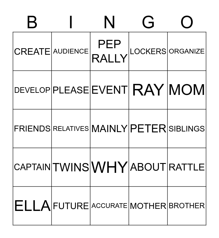 This bingo card has a free space and 24 words: TWINS, FUTURE, EVENT, ELLA, ORGANIZE, CREATE, DEVELOP, AUDIENCE, PETER, WHY, RAY, FRIENDS, ABOUT, RATTLE, PLEASE, MOTHER, SIBLINGS, PEP RALLY, MOM, RELATIVES, BROTHER, CAPTAIN, LOCKERS and ACCURATE.