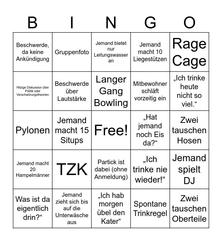 This bingo card has a free space and 40 words: Trinken verschüttet, Pylonen, Beschwerde über schlechte Luft im Zimmer, Beschwerde über Lautstärke, Jemand zieht sich bis auf die Unterwäsche aus, Partick ist dabei (ohne Anmeldung), Langer Gang Bowling, Glas geht kaputt, Rage Cage, Jemand macht 20 Hampelmänner, Jemand macht 15 Situps, Jemand macht 10 Liegestützen, Zwei tauschen Oberteile, Zwei tauschen Hosen, „Hat jemand noch Eis da?“, TZK, Simon gesellt sich dazu, Beschwerde, da keine Ankündigung, Jemand serviert Getränk in Tassen, Jemand bietet nur Leitungswasser an, Jemand spielt DJ, Spontane Trinkregel, Mitbewohner schläft vorzeitig ein, Hitzige Diskussion über Politik oder Verschwörungstheorien, „Ex oder Arschloch!“, Jemand füllt unauffällig sein Getränk mit weniger Alkohol nach, Flunkyball, Beer Pong, Selbstgemachten Alkohol, Jemand findet sein Glas nicht mehr, Jemand verliert sein Handy, Was ist da eigentlich drin?“, Jemand vergisst sein Getränk und trinkt einfach von einem anderen Glas, „Ich trinke nie wieder!“, „Ich trinke heute nicht so viel.“, „Ich hab morgen übel den Kater“, Jemand verschwindet und taucht erst viel später wieder auf, Diskussion über „das beste Bier“, Gruppenfoto and Runde „Ich hab noch nie…“.