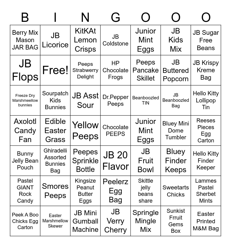 This bingo card has a free space and 50 words: Lammes Pastel Sherbet Mints, JB Buttered Popcorn, Sunkist Frruit Gems Box, Edible Easter Grass, JB Asst Sour, JB 20 Flavor, JB Licorice, JB Verry Cherry, JB Kids Mix, JB Fruit Bowl, JB Sugar Free Beans, JB Coldstone, JB Beanboozled Bag, Beanboozled TIN, Kingsize Peanut Butter Eggs, Reeses Pieces Egg Carton, JB Flops, JB Krispy Kreme Bag, Peek A Boo Chicks Egg Carton, Junior Mint Eggs, Peeps Pancake Skillet, Yellow Peeps, Berry Mix Mason JAR BAG, Free!, Easter Marshmellow Skewer, Easter Printed M&M Bag, Peeps Strabwerry Delight, JB Mini Gumball Machine, KitKAt Lemon Crisps, Dr.Pepper Peeps, Rice Krispies Peeps, Bunny Jelly Bean Pouch, Smores Peeps, Peelerz Egg Bag, Axolotl Candy Fan, Bluey Mini Dome Tumbler, Bluey Finder Keeps, Hello Kitty Finder Keeper, Pastel GIANT Rock Candy, Freeze Dry Marshmeellow bunnies, Peepes Sprinkle Bottle, Skittle jelly beans share, Ghiradelli Assorted Bunnies Bag, Springle Mingle Mix, Hello Kitty Lollipop Tin, HP Chocolate Frogs, Junior Mint Eggs, Sweetarts Chicks, Sourpatch Kids Bunnies and Peeps Gummies.