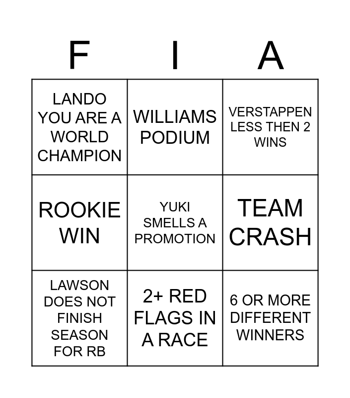 This bingo card has a free space and 8 words: TEAM CRASH, VERSTAPPEN LESS THEN 2 WINS, WILLIAMS PODIUM, LAWSON DOES NOT FINISH SEASON FOR RB, LANDO YOU ARE A WORLD CHAMPION, 6 OR MORE DIFFERENT WINNERS, ROOKIE WIN and 2+ RED FLAGS IN A RACE.