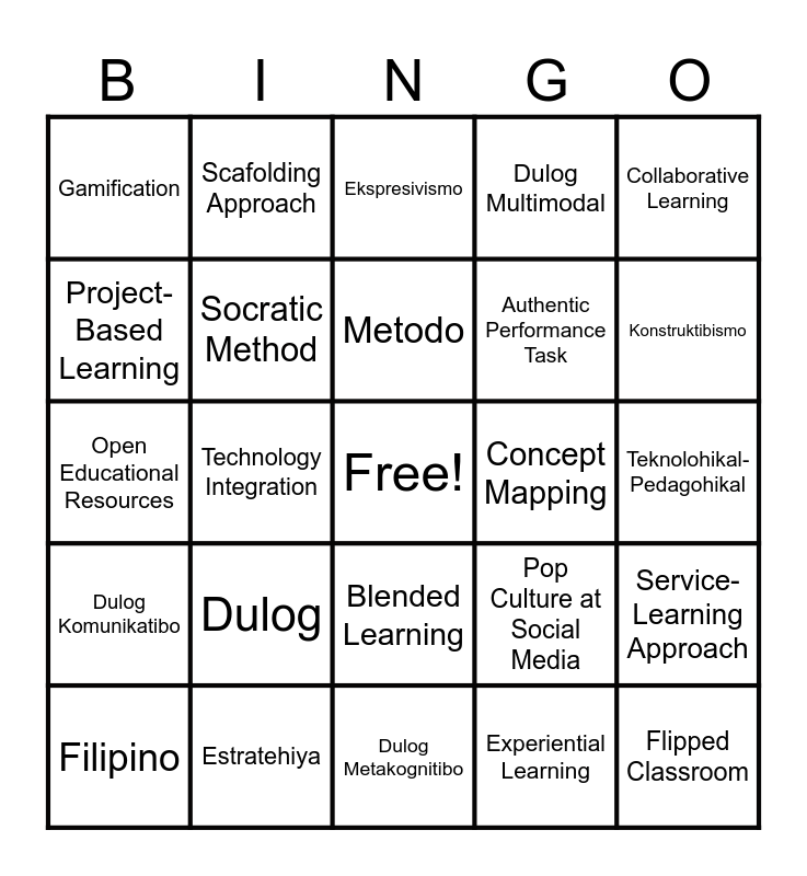 This bingo card has a free space and 24 words: Dulog, Estratehiya, Metodo, Filipino, Collaborative Learning, Gamification, Project-Based Learning, Scafolding Approach, Concept Mapping, Blended Learning, Authentic Performance Task, Open Educational Resources, Pop Culture at Social Media, Service-Learning Approach, Socratic Method, Experiential Learning, Teknolohikal-Pedagohikal, Ekspresivismo, Konstruktibismo, Technology Integration, Flipped Classroom, Dulog Komunikatibo, Dulog Multimodal and Dulog Metakognitibo.
