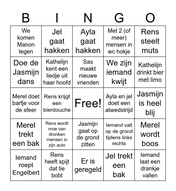 This bingo card has a free space and 24 words: Rens wordt moe van dronken mensen in zijn auto, Rens heeft spijt dat tie bobt, Sas maakt nieuwe vrienden, Iemand roept Engelbert, Rens steelt muts, We komen Manon tegen, Doe de Jasmijn dans, Jel gaat hakken, Ayla en jel doet een atwedstrijd, Jasmijn gaat op de grond zitten, We zijn iemand kwijt, Merel doet barfje voor de sfeer, Iemand valt op de grond tijdens links rechts, Merel wordt boos, Kathelijn kent een liedje uit haar hoofd, Jel trekt een bak, Jasmijn is heel blij, Ayla gaat hakken, Kathelijn drinkt bier met limo, Rens krijgt een bierdouche, Iemand laat een drankje vallen, Merel trekt een bak, Met 2 (of meer) mensen in wc hokje and Er is geregeld.