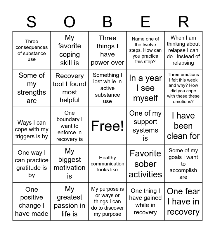 This bingo card has a free space and 24 words: One positive change I have made, My biggest motivation is, Something I lost while in active substance use, One thing I have gained while in recovery, When I am thinking about relapse I can do.. instead of relapsing, Three consequences of substance use, My favorite coping skill is, Three things I have power over, One of my support systems is, I have been clean for, Ways I can cope with my triggers is by, Recovery tool I found most helpful, Favorite sober activities, Some of my goals I want to accomplish are, Some of my strengths are, My greatest passion in life is, My purpose is or ways or things I can do to discover my purpose, Name one of the twelve steps. How can you practice this step?, Three emotions I felt this week and why? How did you cope with these these emotions?, One way I can practice gratitude is by, One boundary I want to enforce in recovery is, Healthy communication looks like, In a year I see myself and One fear I have in recovery.