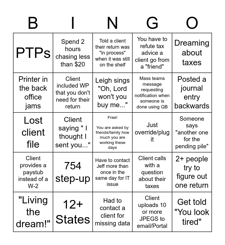 This bingo card has a free space and 44 words: Client asks about audit risk or cost of extending return, Get told "You look tired", Reprint BNA reports 5x, "Living the dream!", Just waiting on a K-1!, Client uploads 10 or more JPEGS to email/Portal, Told a client their return was "in process" when it was still on the shelf, Drinking coffee in the afternoon, Dreaming about taxes, 12+ States, You have to refute tax advice a client go from a "friend", Just override/plug it, Have to contact Jeff more than once in the same day for IT issue, 754 step-up, Email from Monica reminding you to post your time, Had to contact a client for missing data, You hear a partner curse out of frustration, Lost client file, "What did we do last year", Posted a journal entry backwards, Spend 2 hours chasing less than $20, Stranger asks for free tax advice, Return has to be reprocessed, PTPs, Client sells their business, Someone says "another one for the pending pile", Stress eating, Client has four or more1099's from the same brokerage firm, Client calls with a question about their taxes, Client provides a paystub instead of a W-2, Tax system update changes return, 2+ people try to figure out one return, New client inquiry, New client hasn't filed prior year return, Client saying " I thought I sent you...", E-file rejected, Vlad Greb and/or family asking for TR copies, Karin says "I love spreadsheets", Leigh sings "Oh, Lord won't you buy me...", Printer in the back office jams, Mass teams message requesting notification when someone is done using QB, Client walks in hoping to talk to someone without an appointment, Client included WP that you don't need for their return and Print a return with more than 100 pages.