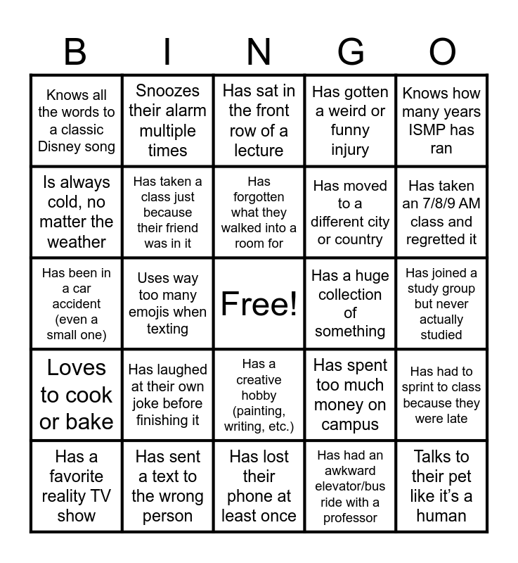 This bingo card has a free space and 24 words: Has laughed at their own joke before finishing it, Has sent a text to the wrong person, Has forgotten what they walked into a room for, Has a favorite reality TV show, Knows how many years ISMP has ran, Knows all the words to a classic Disney song, Is always cold, no matter the weather, Snoozes their alarm multiple times, Has a huge collection of something, Has a creative hobby (painting, writing, etc.), Has moved to a different city or country, Has been in a car accident (even a small one), Has spent too much money on campus, Has had to sprint to class because they were late, Has taken a class just because their friend was in it, Has had an awkward elevator/bus ride with a professor, Has joined a study group but never actually studied, Has sat in the front row of a lecture, Has taken an 7/8/9 AM class and regretted it, Uses way too many emojis when texting, Talks to their pet like it’s a human, Loves to cook or bake, Has gotten a weird or funny injury and Has lost their phone at least once.